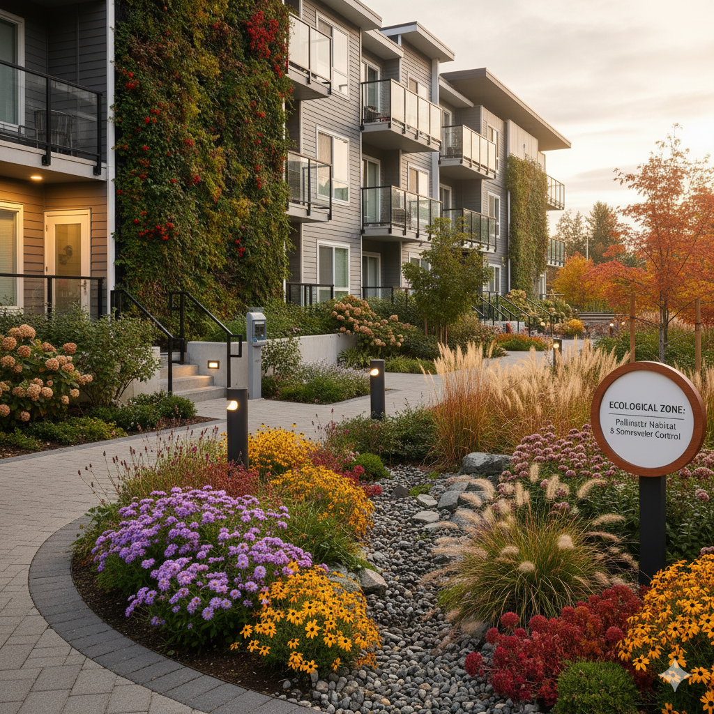 A: Designate back-of-site strips as “neatly natural” zones with meadow mixes, logs, and seedheads. Post signs so tenants understand the ecological purpose.