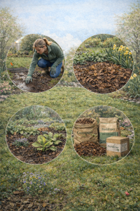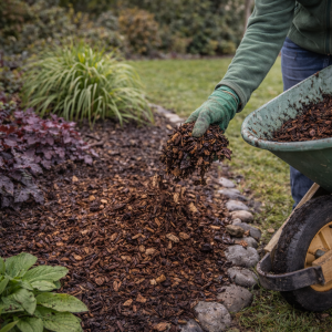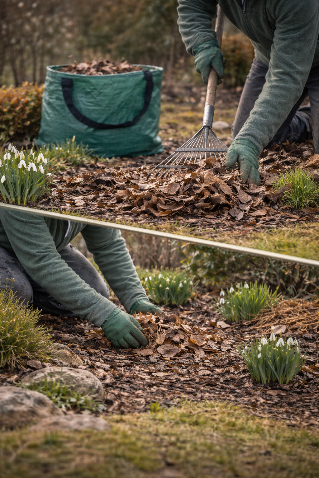We top up mulch after cleanup so beds are protected heading into warmer weather.